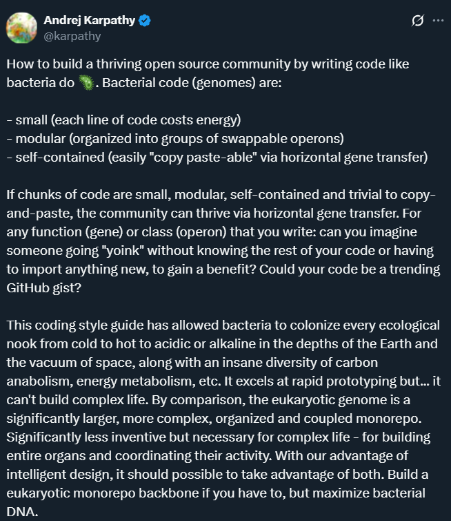 Andrej Karpathy introduces "bacterial programming" - a new coding philosophy inspired by bacterial genomes. Learn the 3 laws of modular, self-contained code.