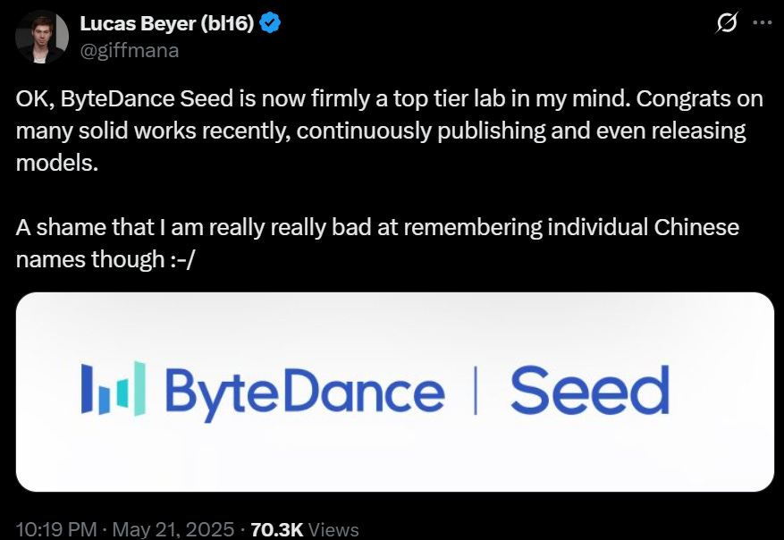 An OpenAI researcher publicly praised it, stating that ByteDance’s Seed team has firmly secured a spot among top-tier labs in his view.