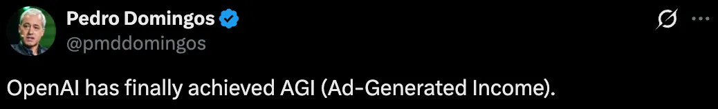 Pedro Domingos, Professor Emeritus at the University of Washington and renowned AI scholar, quipped: “OpenAI has finally achieved AGI, though this AGI isn’t that AGI—it’s Ad-Generated Income.”