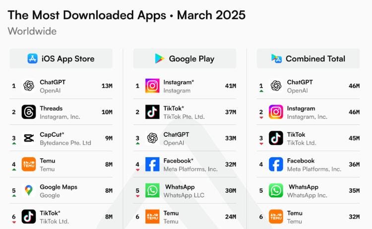 According to Appfigures data, ChatGPT became the most downloaded non-gaming app globally in March, surpassing giants like Instagram and TikTok. It recorded 46 million new downloads that month, a 28% increase from the previous month, setting a historical record.