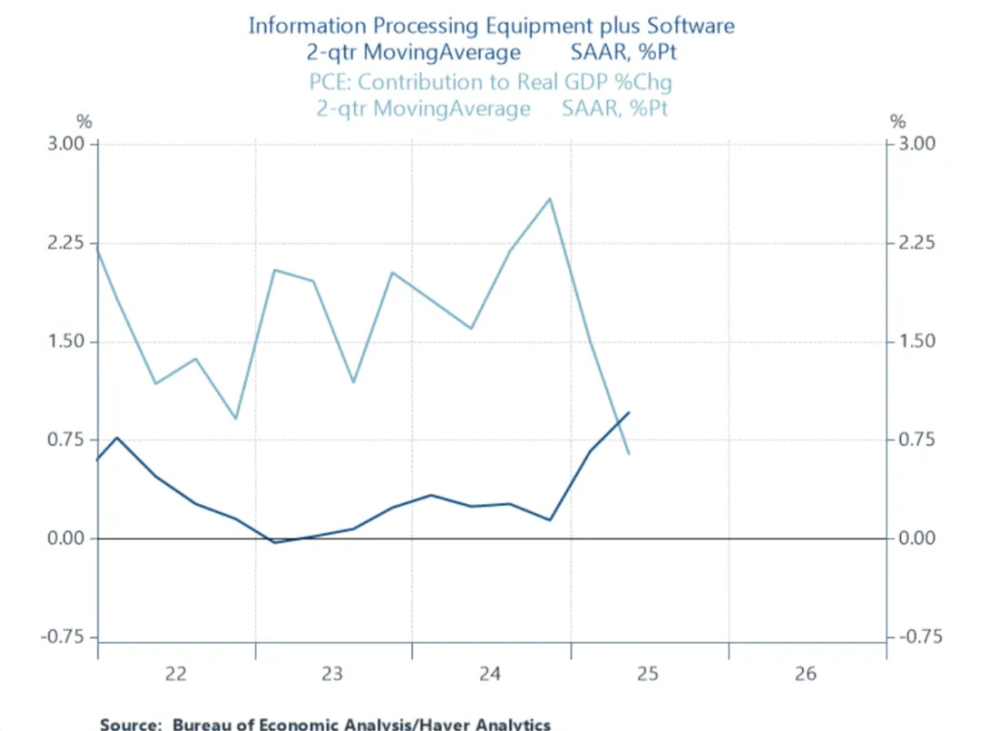 Another alarming piece of news is that last quarter, US artificial intelligence capital expenditure exceeded consumer spending for the first time, becoming a driving force of GDP.