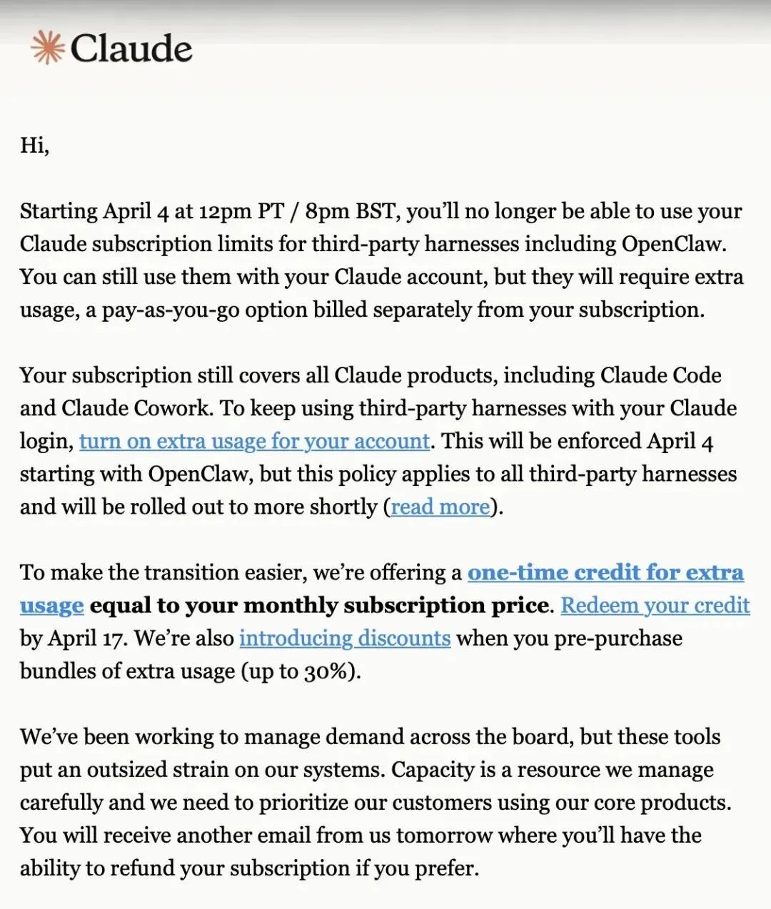 The official email sent by Claude also stated that this policy will first be strictly enforced on OpenClaw starting April 4, but it applies to all third-party toolchains and will soon be extended to more tools.
