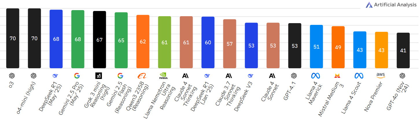 In the AI Analysis Index proposed by this organization, DeepSeek-R1-0528's index jumped from 60 points to 68 points, tying for third place with Google's Gemini 2.5 Pro.