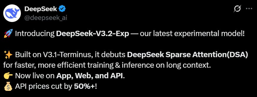 DeepSeek open-sources V3.2-Exp with new DSA sparse attention mechanism, boosting long-context efficiency while cutting API costs by 50%.
