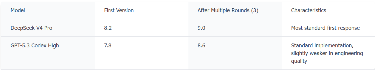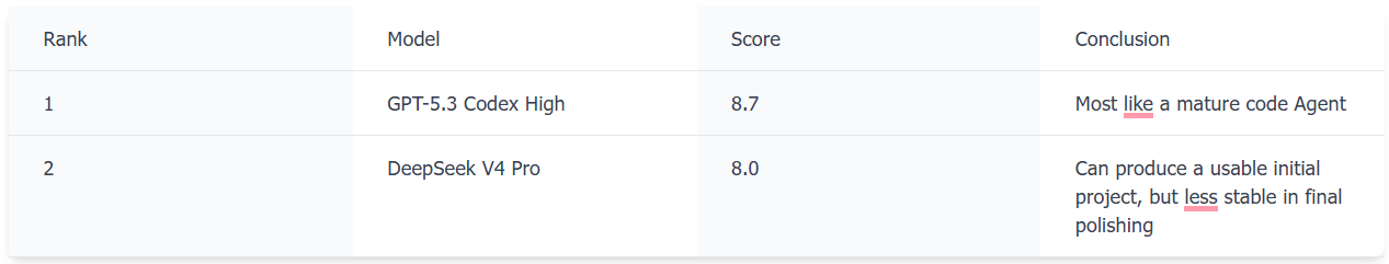 This test used DeepSeek V4 Pro (accessed via Claude Code) and GPT-5.3 Codex High. The evaluation model was GPT-5.5 Thinking.