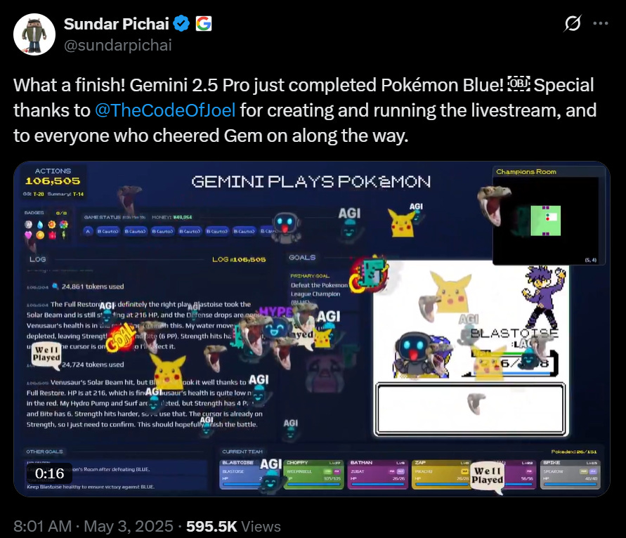 Just moments ago, Gemini 2.5 Pro beat Pokémon Blue live on stream!