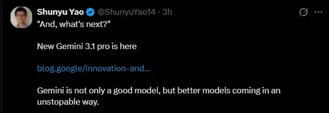 Shunyu Yao, who participated in the Gemini 3 Deep Think research, also posted on X introducing this new breakthrough, stating: “Even better models will continue to emerge in the future.”