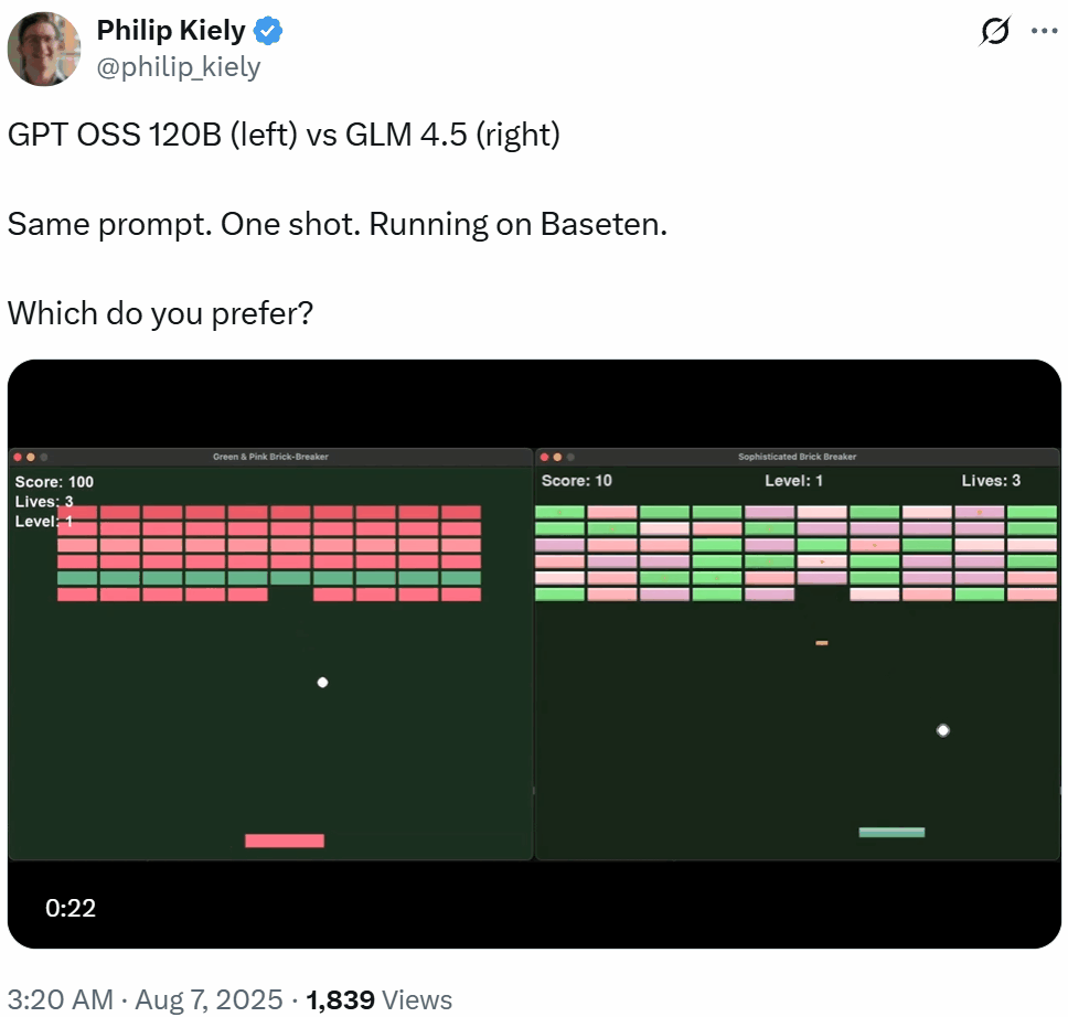 While the excitement continued to build, OpenAI also open-sourced the highly anticipated gpt-oss series models. Users immediately pitted it against GLM-4.5, and the latter's overall performance remained impressively sharp.