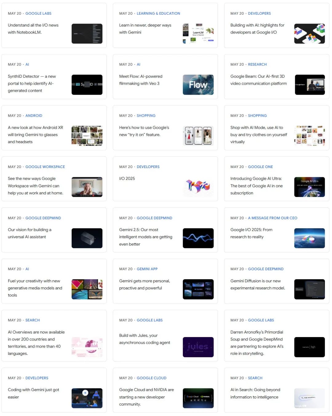 Unsurprisingly, this year's core theme is naturally AI. At the conference, Google released or upgraded a series of AI-related tools and services, as shown in the image below. However, there were also some unexpected releases.