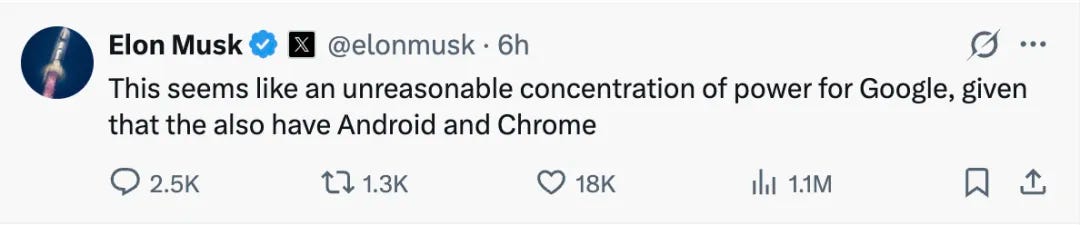 As soon as the news broke, Elon Musk jumped on social platform X to comment bluntly: “Considering Google also owns Android and the Chrome browser, this concentration of power seems somewhat unreasonable.”