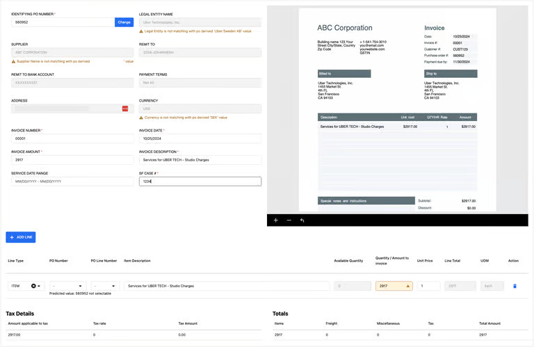 High field count: Each invoice had 15–20 fields plus multi-line item details, all of which needed to be right.