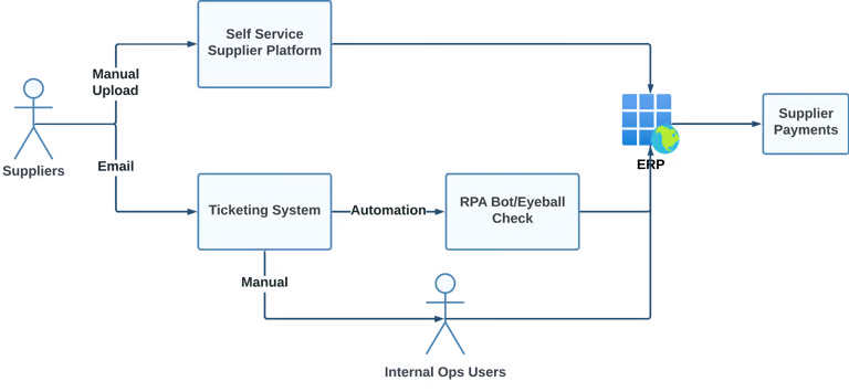 Email-based submission: Suppliers email an invoice to Uber. Those emails go into a ticketing system, get tagged based on rules and then they are processed using RPA or manually.
