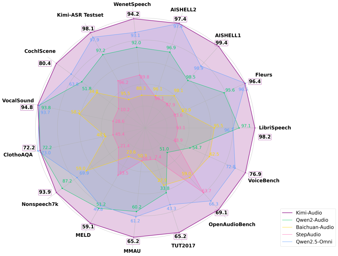 The development team created an evaluation toolkit to fairly and comprehensively assess audio LLMs across multiple benchmark tasks. The performance of five audio models (Kimi-Audio, Qwen2-Audio, Baichuan-Audio, StepAudio, and Qwen2.5-Omni) was compared across various audio benchmarks. The purple line (Kimi-Audio) essentially covers the outermost layer, indicating its superior overall performance.