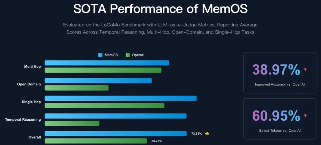 MemOS: Open-source memory OS for LLMs with 159% improvement in temporal reasoning vs OpenAI. Reduces token costs by 60% while boosting accuracy.