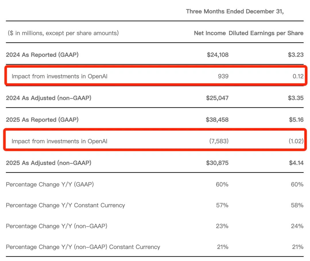 Microsoft's Q2 FY2026 earnings: revenue up 17% to $81.3B, GAAP net profit surged 60% to $38.5B driven by $7.6B OpenAI investment gains, Intelligent Cloud hit $32.9B (+29%), cloud topped $50B.