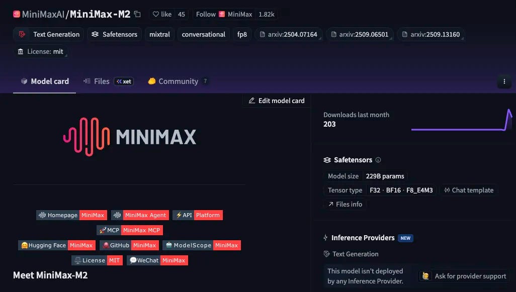 MiniMax-M2 focuses on improving agent efficiency and is an MoE (Mixture of Experts) model with a total of 230 billion parameters, including 10 billion active parameters, balancing programming and agent tasks as well as general intelligence.