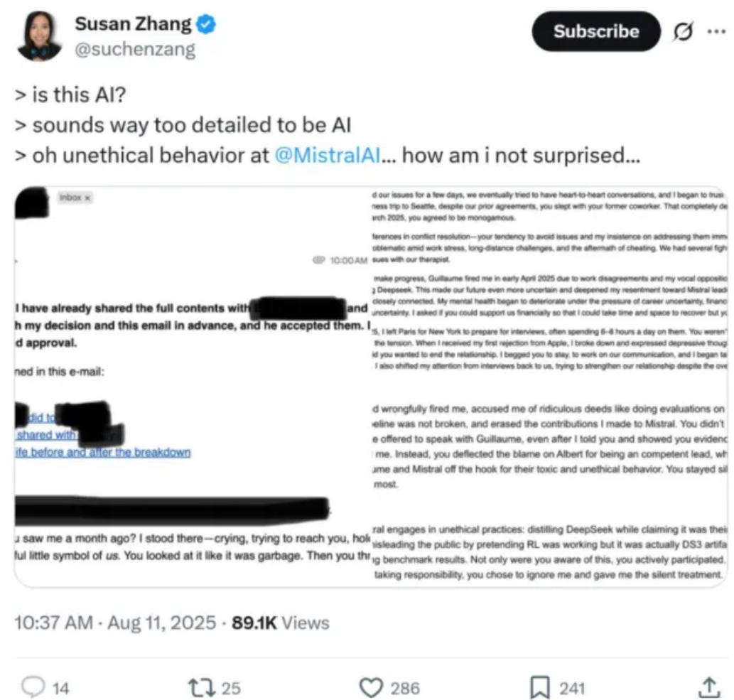 A Twitter user broke the news that a female former Mistral employee sent mass emails exposing multiple company scandals.