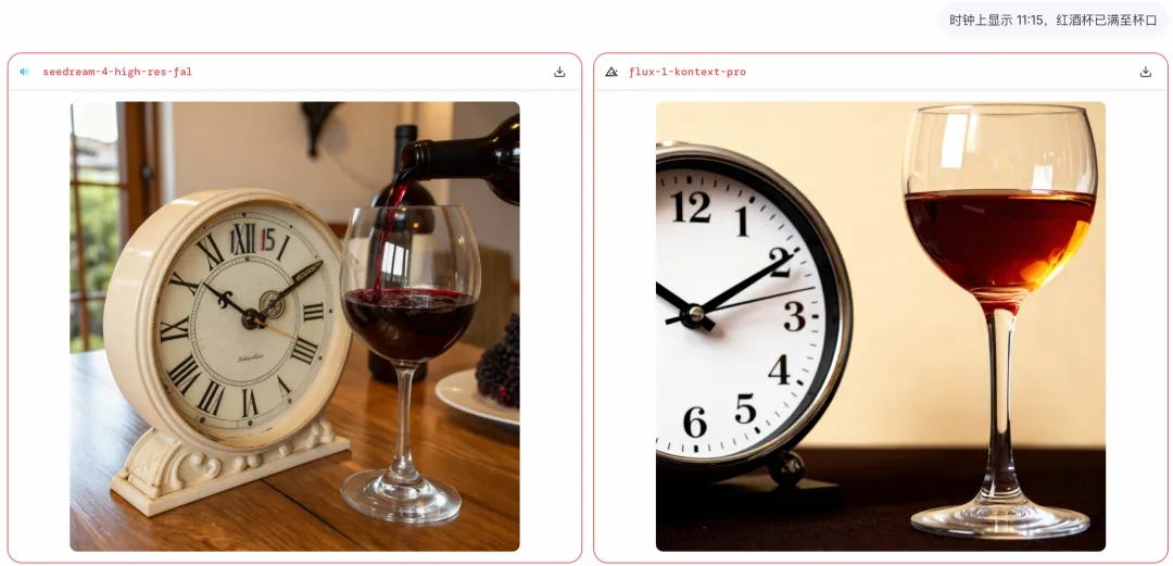 We tried multiple times on the large model arena, Doubao Seedream, and nano banana 1.0 version. No AI could accurately display the clock markings and a glass of wine filled to the brim.