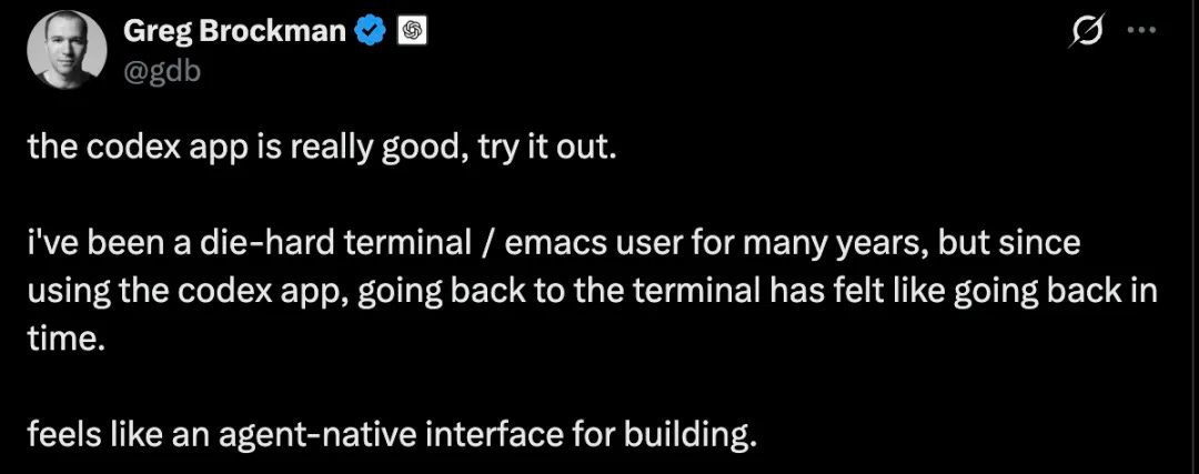 This is, of course, the rainbow fart (glowing praise) from OpenAI President Greg Brockman for the newly launched Codex App—whether it’s actually good or not, the users will have the final say.
