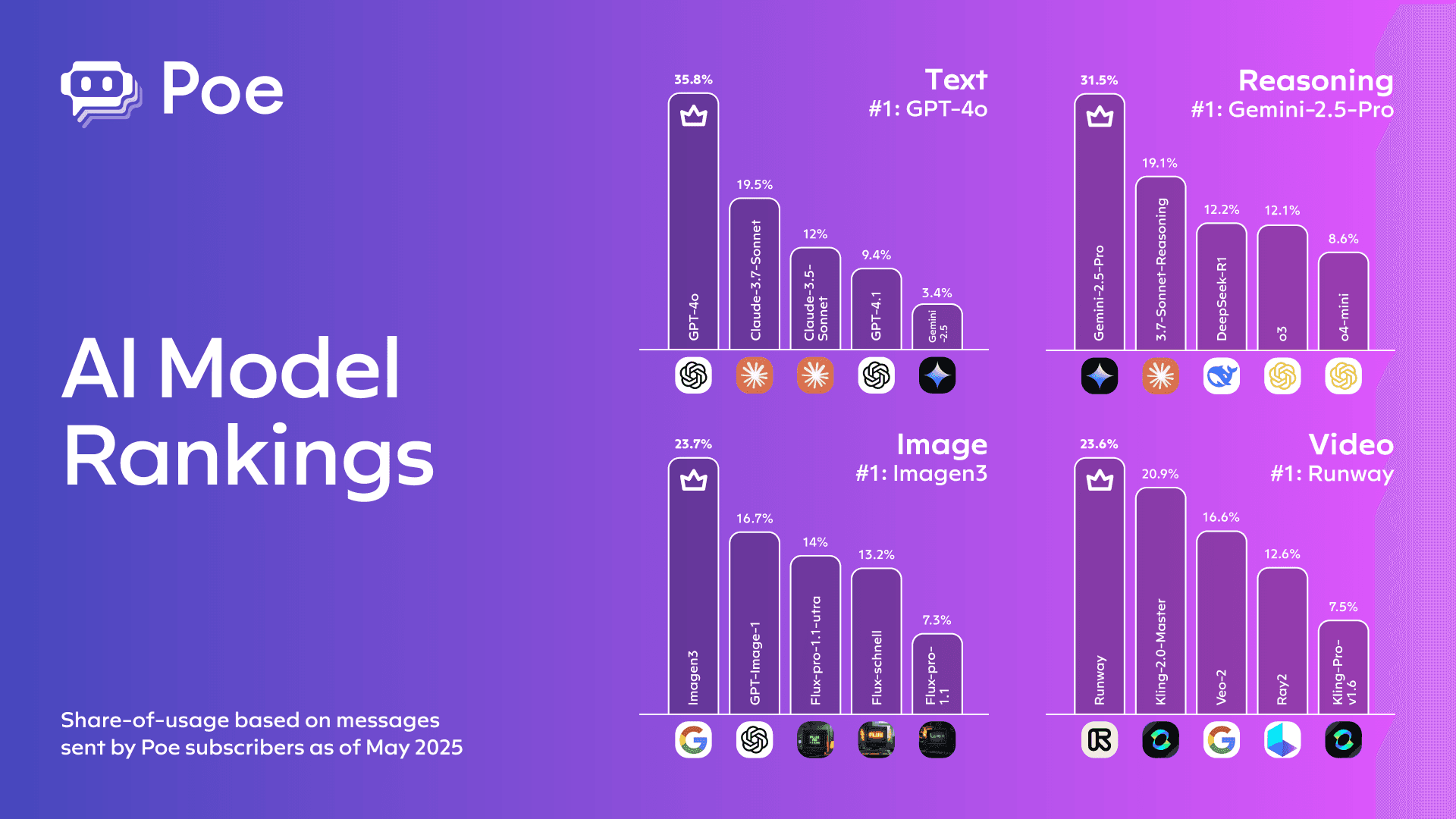Poe's API connects all models and bots on its platform. You can seamlessly call top-tier language models like Claude, Gemini, o3, and access image, video, and audio generation models like Imagen 4, GPT Image 1, Veo 3, Runway Gen 4 Turbo, Kling 2.1, etc.