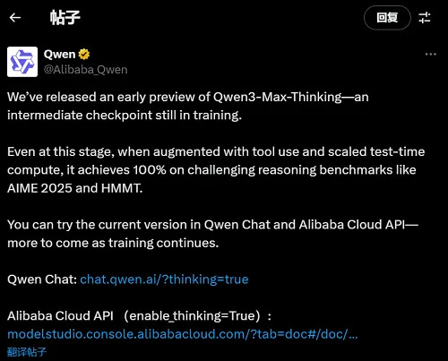 However, this model actually received an “advance preview” on Lin Junyang’s (head of Tongyi Qianwen) personal social media account: at 11:54 PM on November 2nd, Lin posted “It’s here, you can try it,” accompanied by an image of Qwen3-Max with thinking mode enabled.
