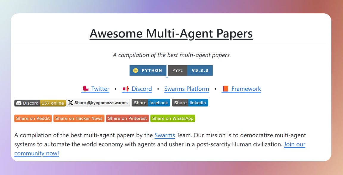 awesome-multi-agent-papers is a collection of top academic papers in the multi-agent field. The project offers a list of papers covering various aspects of multi-agent systems, providing a high-quality academic resource for researchers and developers.
