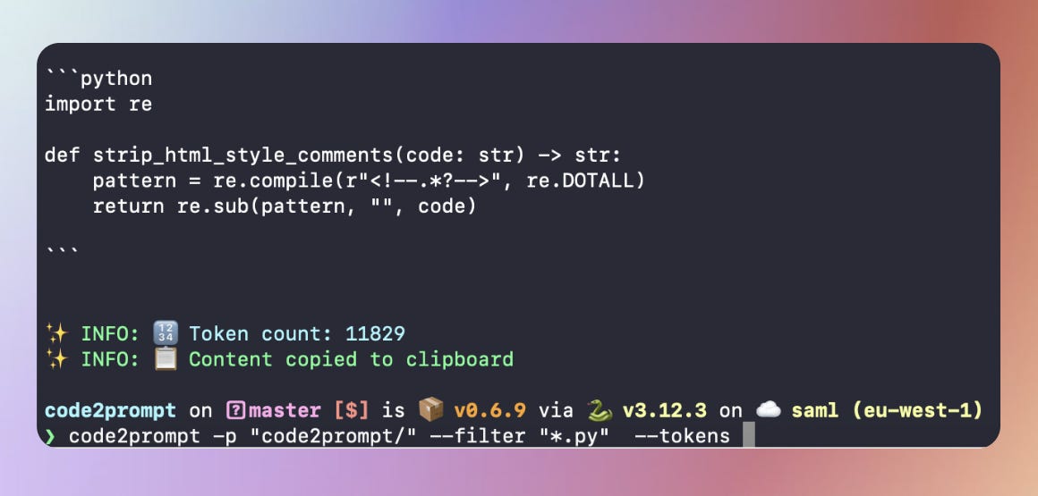 Code2Prompt is a powerful command-line tool that simplifies providing context to LLMs. It generates comprehensive Markdown files containing codebase content, helping developers use LLMs for code analysis, documentation generation, and improvement tasks.