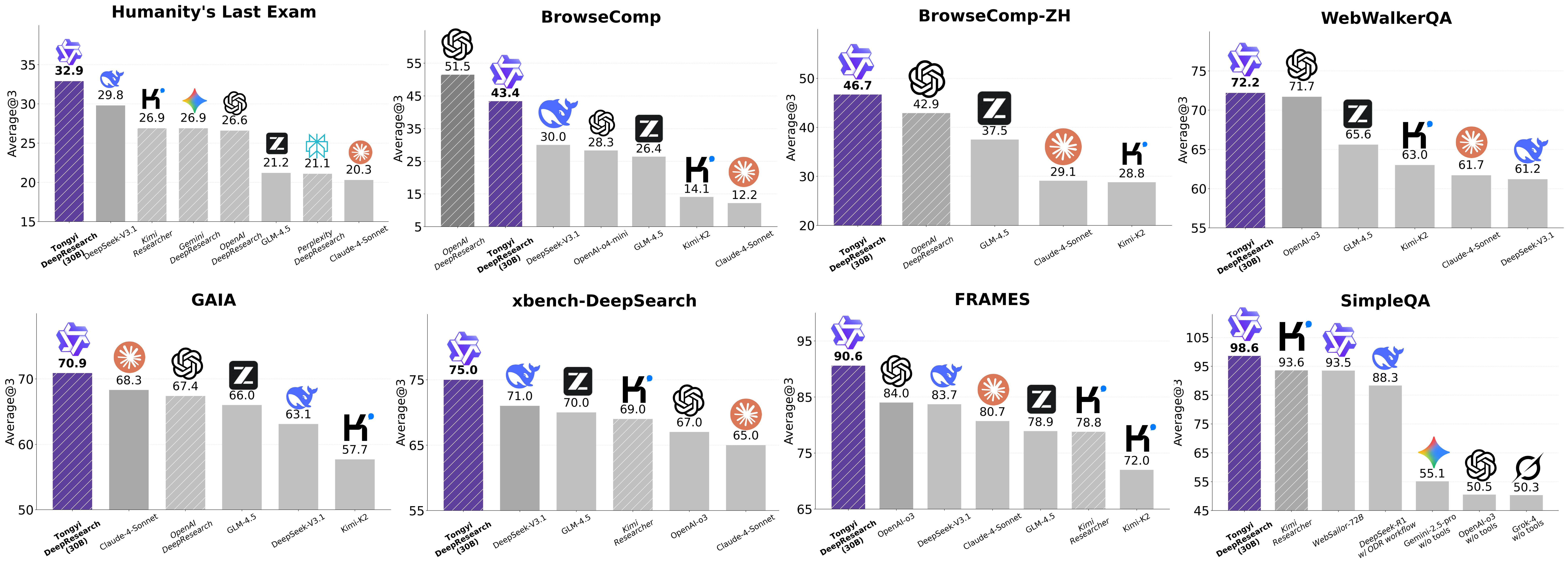 Compared to ReAct Agents based on foundation models and closed-source Deep Research Agents, this 30B-A3B lightweight model, Tongyi DeepResearch, achieves SOTA performance on multiple authoritative evaluation benchmarks, including HLE, BrowseComp-zh, and GAIA, surpassing Agent models like OpenAI Deep Research and DeepSeek-V3.1.